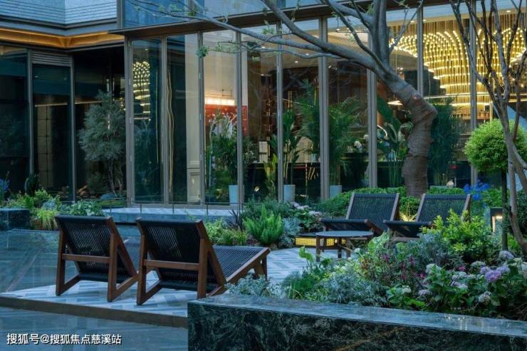 下沉庭院采用普拉达绿奢石墙与叠水庭院、红枫绿岛相融共生,营造出无限延绵的自然意境。石墙的细腻纹理在水波中荡漾生辉,与园林小径相接,直通会所雅致之门。日本红枫的婆娑光影透过玻璃窗洒落室内,铺展成一幅“景室相映,内外交融”的绝美画卷。