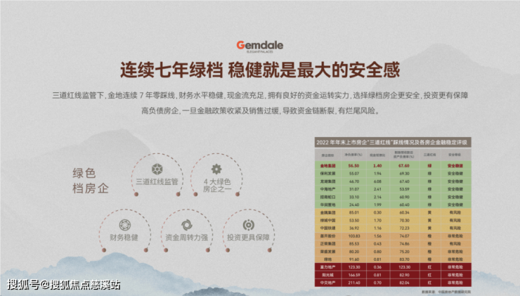 ▪金地集团成立于1988年,35载沉淀,布局全球86城,连续七年销售额破千亿。三道红线政策下连续七年零踩线,财务水平稳健,选择绿档房企更安全,投资更有保障。