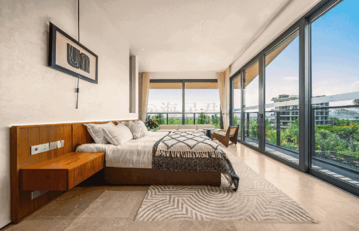 到了二层行政级主卧套房,以半开敞式设计, 3.3米的层高+落地玻璃窗 ,将采光面放大形成 270°视野 ,自由环揽半山峯景。