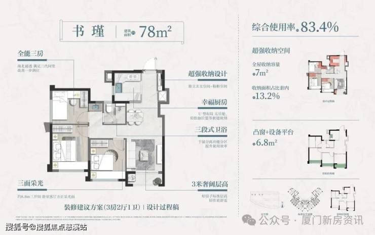 建发·书香云锦78㎡户型综合得房率高达83.4%,空间高效利用,打破了刚需对上车产品的刻板印象。不计产权面积约6.8㎡,相当于多送了一间小书房或储物间,妥妥的白捡的大便宜。而且该户型还做到户户边套,南北通透,卧室并非普通产品的采光井采光,而是正常的开窗面采光,真正做到刚需产品改善的品质。
