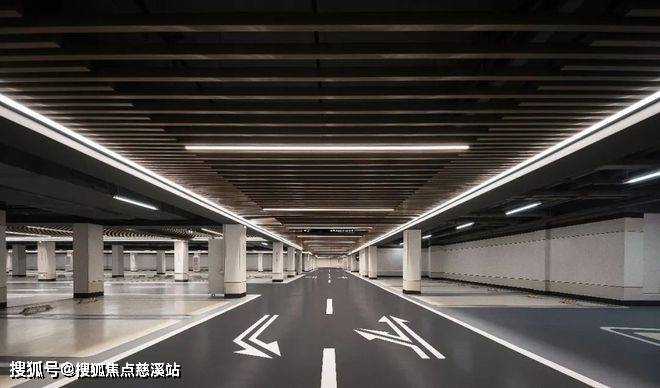 另外,负一层主车道的铝制格栅吊顶,打造了2.5米层高的舒适行车体验;全地面采用环氧地坪,防滑减噪的同时,深灰色调美观大气。