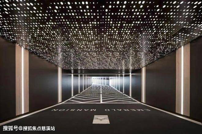 一进地库,首先映入眼帘的便是繁星穹顶。坡道入口采用星空顶装饰,两侧墙壁也是铝板+岩板材质,搭配环形序列条灯,星光熠熠,归家时的尊荣感不言而喻。