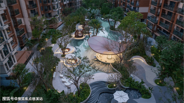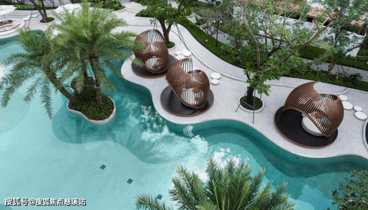 洋房区以泳池为核心进行功能展开,自然流动的曲线,放松的海岛布置,风情的凉亭餐吧,多样的场景体验,都在创造具有独特在地符号和场所记忆的艺术空间,紧密围绕这些开展社区的水上活动,泳池派对,同时又是一种热带海岛的度假体验。