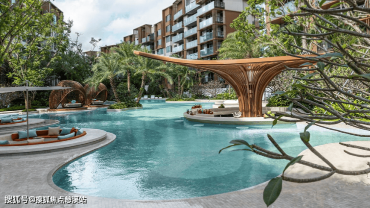 泳池律动的线条灵感源于自由流动的海水冲刷,形成海洋中丰富的肌理,漂浮的绿岛穿插其中,来到这里仿佛置身于海岛森林里,在海天一色的蓝色秘境中,享受椰林海风、斜阳霞光,海风呢喃。