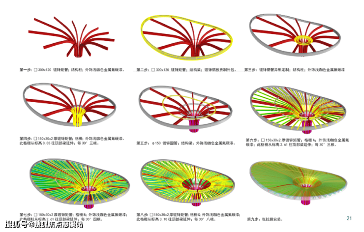 吧台构架灵感来源于热带植物叶片,廊架中每一根“叶脉”由参数化设计精确建模出图,通过施工图再翻模出施工手册指导施工,保证落地效果。