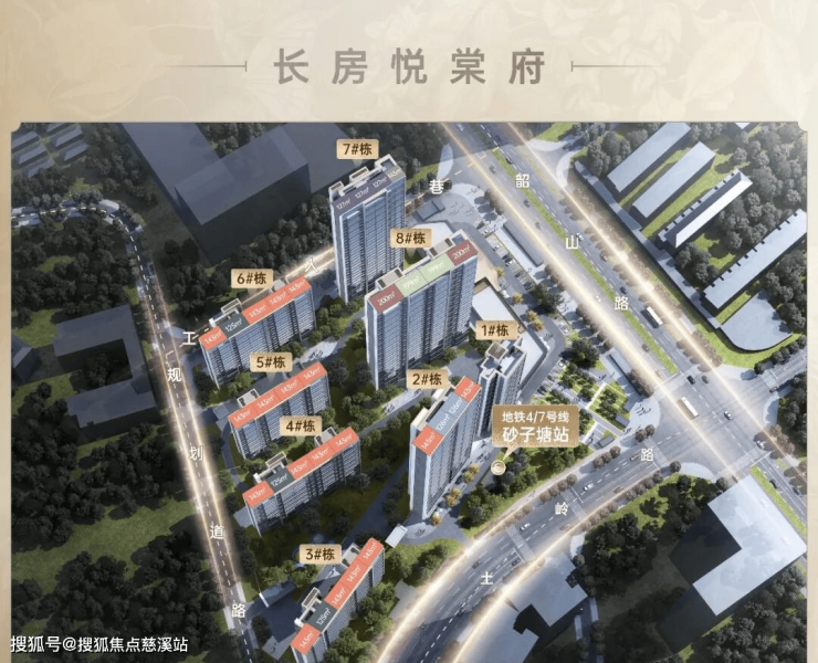 方圆900米范围内,坐拥韶山路、芙蓉路双干道,更拥揽地铁1号线、3号线、4号线、7号线(在建,预计2027年建成通车),傲立地铁4/7号线砂子塘上盖,通行全城无碍,纵观长沙,止此悦棠府。