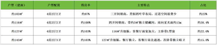 户型设计兼顾了舒适与功能性。约116㎡的主力户型做到了四开间朝南,南向采光面约13米,采光通风好。U型厨房设计使动线流畅,并采用厨房、餐厅、客厅一体化设计,空间感更强。全屋仅餐厅/卫生间有承重墙,空间改造灵活性高。