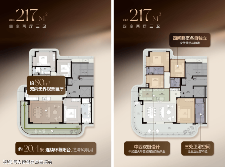 家族平层(建面约217-273㎡):以约10.8米南向超级横厅为核心,连接进深达2.4米的环幕阳台,形成IMAX级全景瞰海视野。空间布局充分考虑多代共居的需求,实现家庭成员亲密互动与独立私密的平衡,是传承与共融的家族主场。