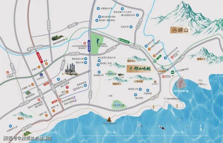 整个板块兼顾城市繁华与山海资源,向东可达沙子口湾、崂山风景区,向西比邻午山森林公园、石老人商圈……山、湖、林、海、城,相依相伴,是主城区不可多得的低密度社区。