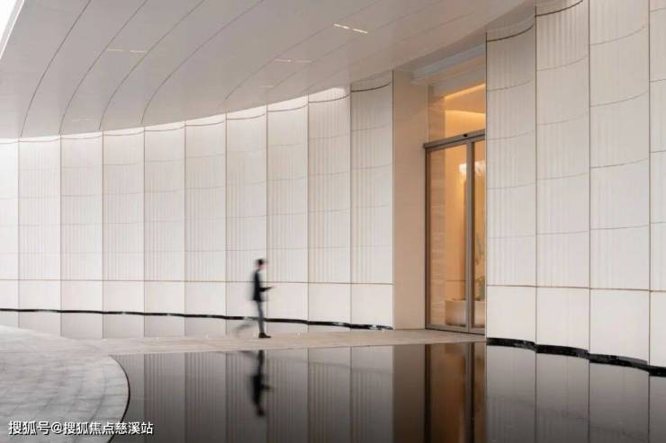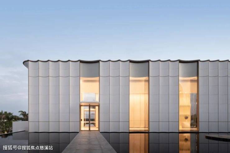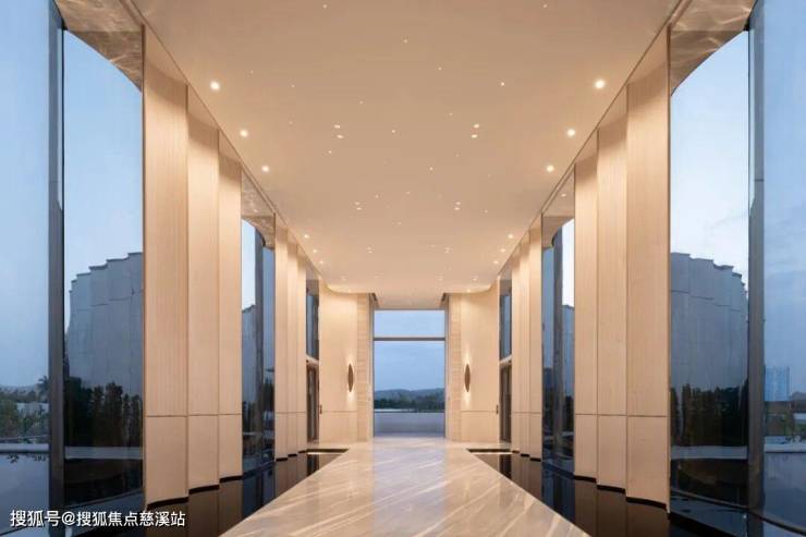 艺术长廊内的水景与室外水景相连,消隐了室内外的边界,放大长廊的空间感受,让人仿佛置身于一片海域之中;通高的玻璃墙面和折面墙体形成序列,增强了艺术长廊的仪式感和艺术氛围。弧形的石材和玻璃取意海浪的波纹,通过竖向拉升和水面镜像效果,勾勒出精致优雅、颇具雕塑感的建筑形象。
