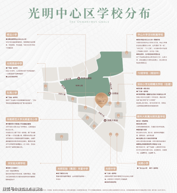 优质小学:项目北侧72班学校(在建,预计24年开始招生)、光明小学、深圳小学光明曙光学校(在建,预计24年开始招生)、华师大附小等