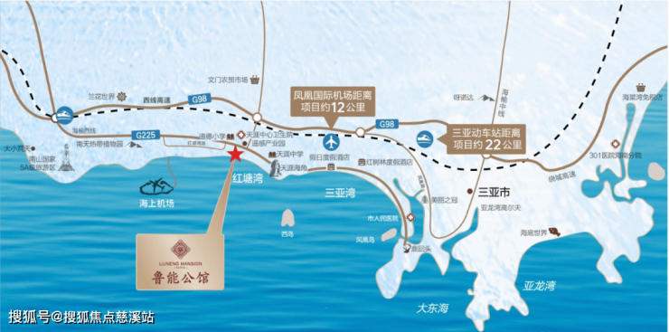 福泽之地:东临著名旅游风景区天涯海角,西接国家5A级文化景区南山寺、大小洞天,北靠马岭、发财岭等一众山岭,南侧则面向广阔南海,与西岛隔海相望,是汇聚释、道、儒等多种文化的福泽之地。