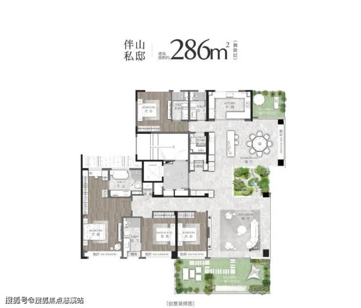 该户型也是市面非常能打的明星户型,四室两厅三卫,其中主卧开间4.3米,有270的环幕落地窗。有南北两个空中庭院,南侧最大,进深达到了3.2米,北侧的空中庭院面积也不小,通过厨房、家政空间的北侧,通过单扇门进入,整体感觉也相当不错,感兴趣的朋友可以到现场实地感受。