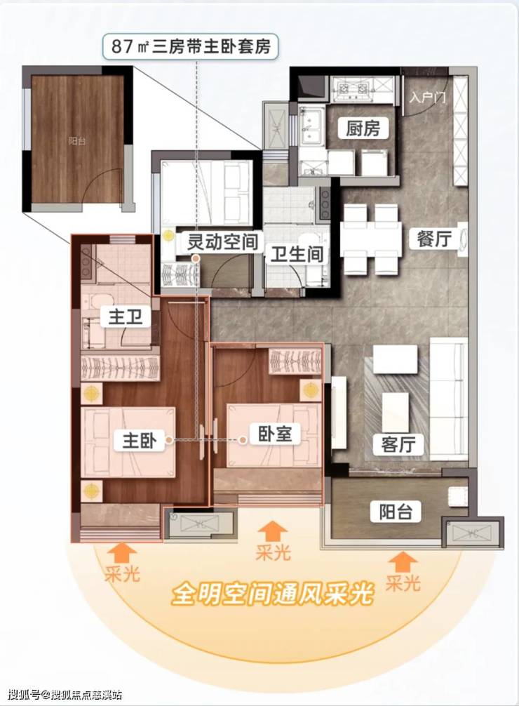 建面约87㎡2+1房,总价约170万,是年轻家庭的心头,总价可控,做到了“同等面积比别人多一房”,实现一步到位。