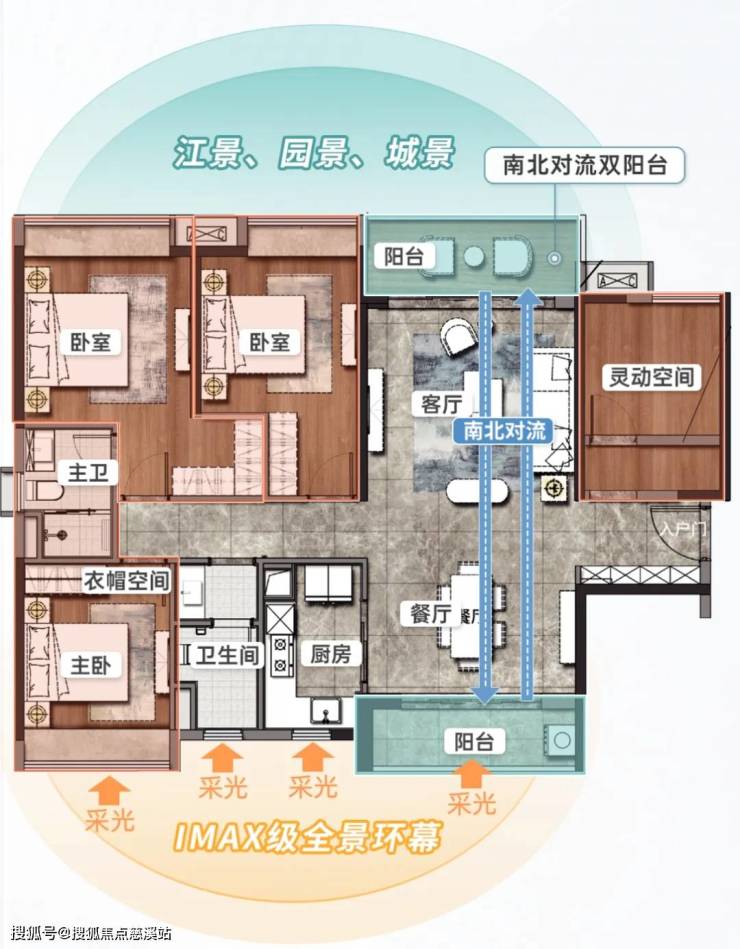 建面约122㎡四房,空间使用率更进一步,做到了南北对流,且带约3.8米景观阳台,180°无遮挡超大景观视野,尽揽窗外美景。