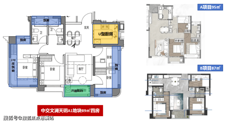 中交文澜天玥89㎡户型,做到四房+四面宽朝南+全明采光+U型厨房+主卧270°观景,保障了主要居室和客厅都处于景观面上,享受更好的采光通风。