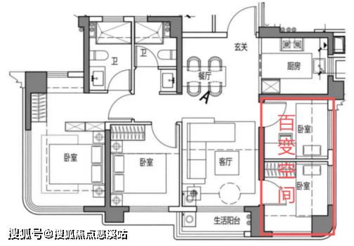 其中与厨房区挨着的两个竖向房间,通过轻质隔墙隔断。既可以整体改成拥有270°采光面的大房间,也可以在家庭成员增加后改两个房间,让户型随着家庭成长而成长,保障至少可以10年不换房。