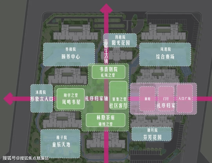 项目传承凤鸣书院的空间格局和文人雅趣,呈“两轴,四堂,六院” 串联整个空间序列,打造多层庭院递进的景观空间结构,形成一处兼具人文内涵与时尚居住的现代社区,营造书香浸润的独特景观体验。