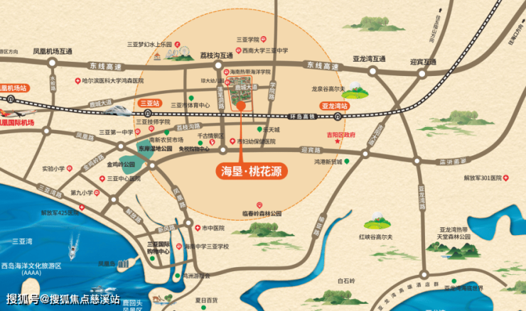 海垦・桃花源位于三亚市吉阳区荔枝沟落笔洞路38号,地处落笔洞路、鹿城大道两大城市主干道交汇处。这个位置属于三亚重点发展的抱坡新城区,在未来规划中,这里被定位为三亚的宜居新中心。