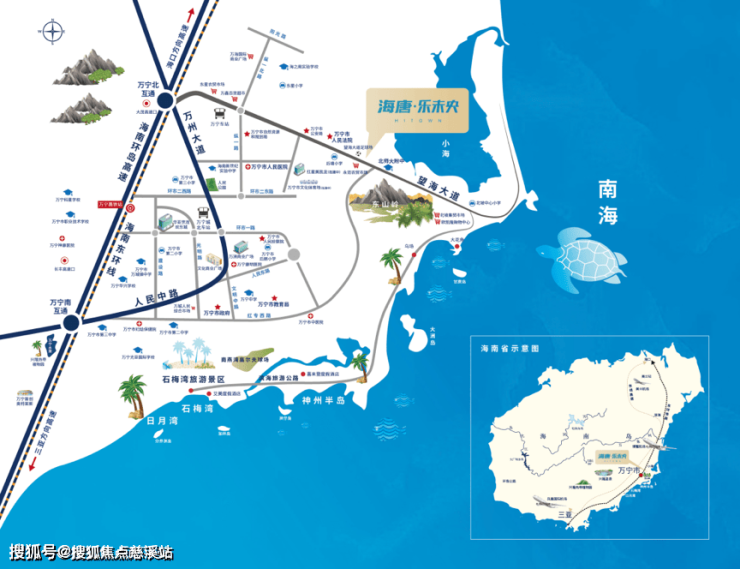 项目近揽一线海景,往东步行可至小海,在蓝天碧海中看渔舟归来,享受新鲜而丰富的海产盛宴;东部“海南第一山”东山岭,是海南开发较早的旅游景点之一;滨海旅游公路30分钟内可达石梅湾、日月湾、神州半岛等8大湾区,悠享丰沛生态旅游资源。