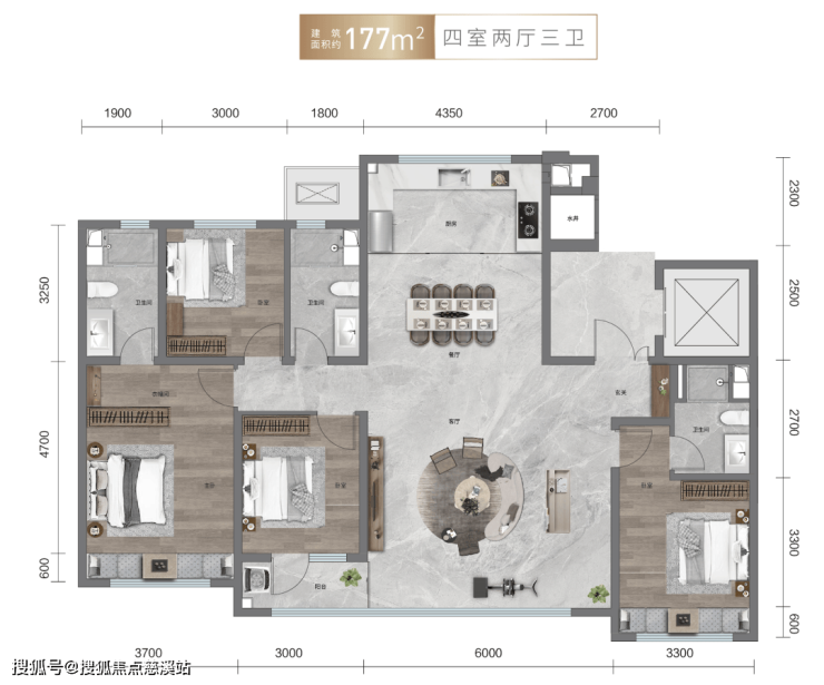 177m²四室两厅三卫精装样板间户型产品力及精装设计:在户型产品力上实现南向4.5开间,南向整体面宽达到了极致的16米左右,双阳台开间为9米,其中客厅的开间达到了约6米的奢华尺度。