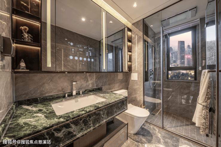 主卫的大理石多层次肌理与金属镜框的勾勒下,营造意式轻奢的氛围感。定制魔镜镜柜,在意式浪漫中增加科技智能体验,魔镜的多色彩氛围灯以及音乐的营造下,为生活增添了更多乐趣与浪漫。
