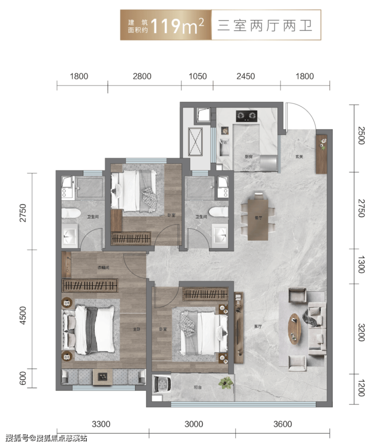 119m²三室两厅两卫户型产品力:该户型采用“动静分区”的空间布局,南侧为双阳台巨幕落地窗,其对视觉感官的冲击力很强,打开入户门的第一感受就是特别的敞亮,采光视野在同面积段户型中做到了极致。