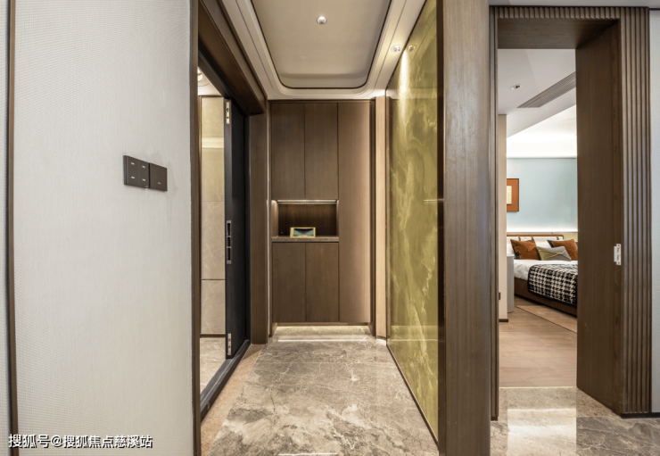 玄关处,高奢古青玉岩板背景墙面,将中国传统玉石的灵气、祥和之意与现代空间相融合,进口木皮木饰面与高奢岩板相组合,演绎着经典的意式优雅,在做工细节的处理上也体现出海尚府项目要引领济南大平层产品的决心,极致的精工,彰显出归家的仪式感与男女主人的身份地位。
