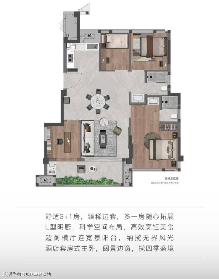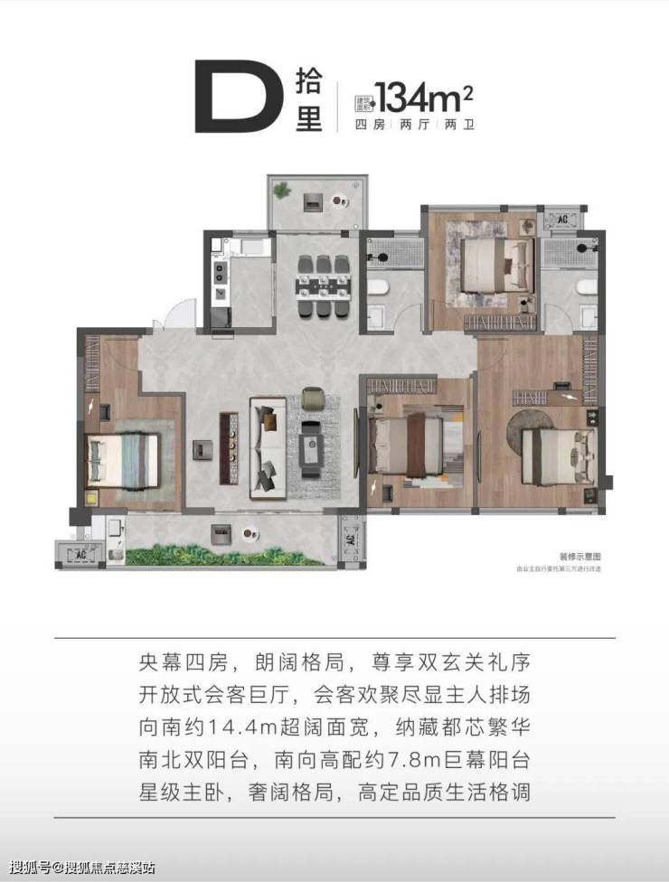 建面约134㎡央景四房,坐拥社区至佳景观与私密视野。户型南向面宽达约14.4米,连接南北双阳台,通透采光。约53㎡的LDKB一体化社交厅,融合客、餐、厨与阳台,形成开阔的家庭互动场。满足品质改善家庭对尺度、功能与体验的全维需求。