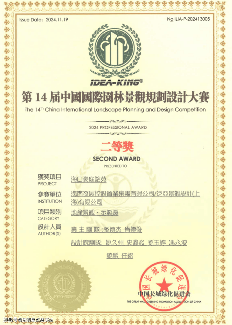 近日,豪庭铭苑营销中心暨艺境美学生活馆,凭借别具一格的室内软装及景观人文美学的精妙融合,犹如一颗璀璨明珠在全球设计舞台上大放异彩,荣获2024年美国TITAN地产设计大奖室内设计类金奖,并在2024年第14届中国国际园林景观规划设计大赛(艾景奖)中荣获地产景观·示范区类二等奖,为公司品牌篇章再添浓墨重彩的一笔。