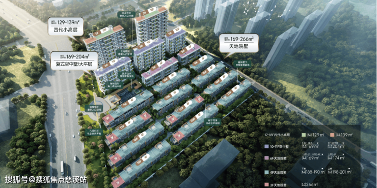 第一排:2栋17-18层四代宅,129、139平四房,户户带露台花园;第二排:3栋10-11层四代宅,169平复式洋房,户户带南北双向露台花园;第三排:2栋6层叠墅,169-174平上中下叠,户户南北大露台;第四排起:12栋4层叠墅,198-201平上叠、188-190平下叠,创新一梯一户设计。以上户型全部精装修交付。少量3套204平大平层(第二排),8套266平独栋别墅(第四排起),毛坯交付。