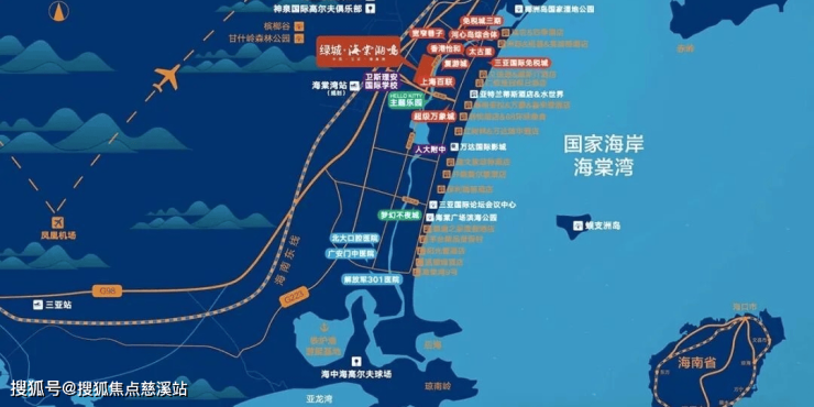 国家海岸海棠湾、蜈支洲岛旅游资源、万亩国家湿地公园、椰子洲岛、海中海高尔夫、老虎高尔夫学院;