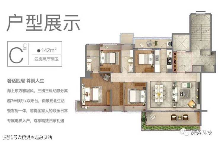C户型 四房两厅两卫 建筑面积142㎡