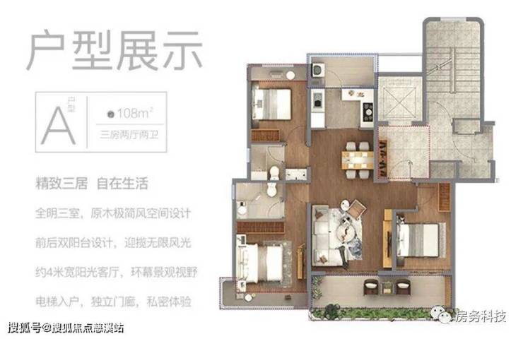 A户型 三房两厅两卫 建筑面积为108㎡
