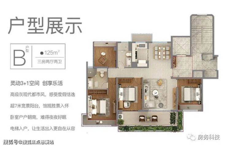 B户型 三房两厅两卫 建筑面积为125㎡