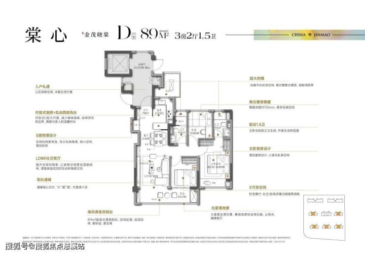 户型灵活:主力户型为89㎡三房1.5卫、110㎡三房两厅两卫,采用LDKB一体化设计,空间利用率高,部分户型可拓展至120㎡使用面积。