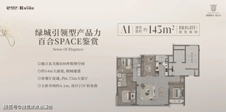 143㎡三/四室:独立玄关+800库收纳空间;约14米面宽;客餐厅连通,约6.75大宽厅;主卧开间约4.1米,带270度拐角落地窗。缺点是有两个北卧。