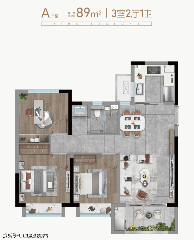 建面约89㎡起步户型,主打高性价比实用三房。户型方正,三开间朝南,LDK一体化设计,餐厅特别增加了开窗设计,增加了室内通透性。卫生间做了干湿分离设计,保证同时使用时的效率。同时,项目并没有一味追逐流行,加大客厅开间而忽略卧室空间的尺度。而采用了更加合理的尺度去平衡每个房间的尺度关系,卧室舒适并兼具充足收纳功能。