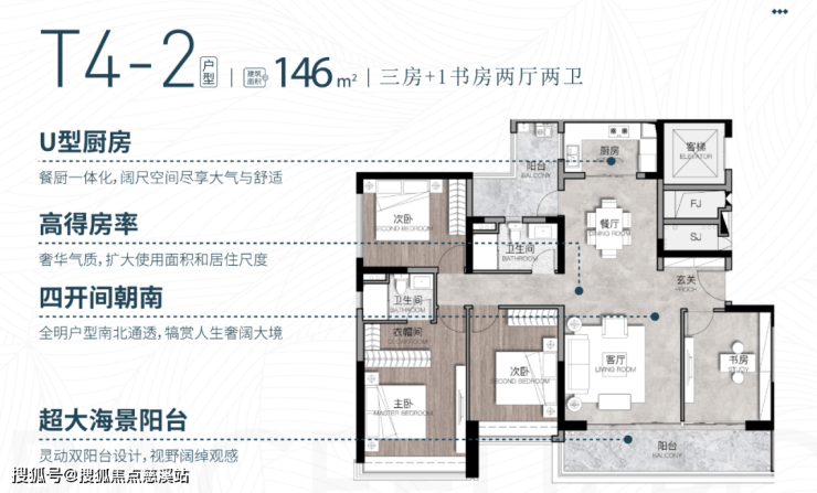 146㎡ 三房+1书房两厅两卫 户型(平层)