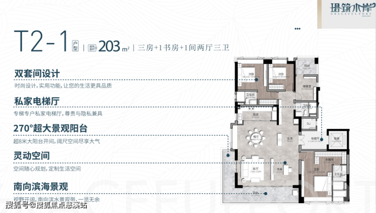 203㎡ 三房+1书房+1间两厅三卫 户型(平层)
