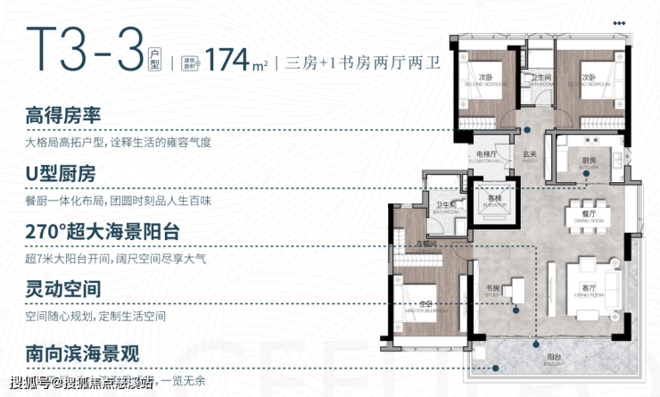 174㎡ 三房+1书房两厅两卫 户型(平层)