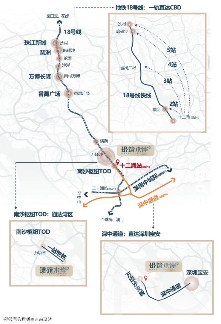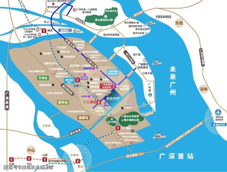 项目距离深中通道广州出入口约2公里,距离广州地铁18号线十二涌站约1.2公里,坐享广深中珠四地城际交通核芯。