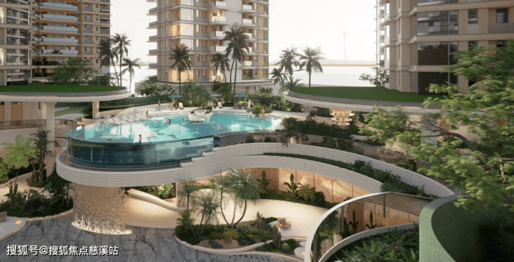 以超前手法打造约320㎡无边际悬空泳池,通过流水叠瀑链接负一层会所,于此可举办落日派对、池边社交,生活场景由此无限延伸。