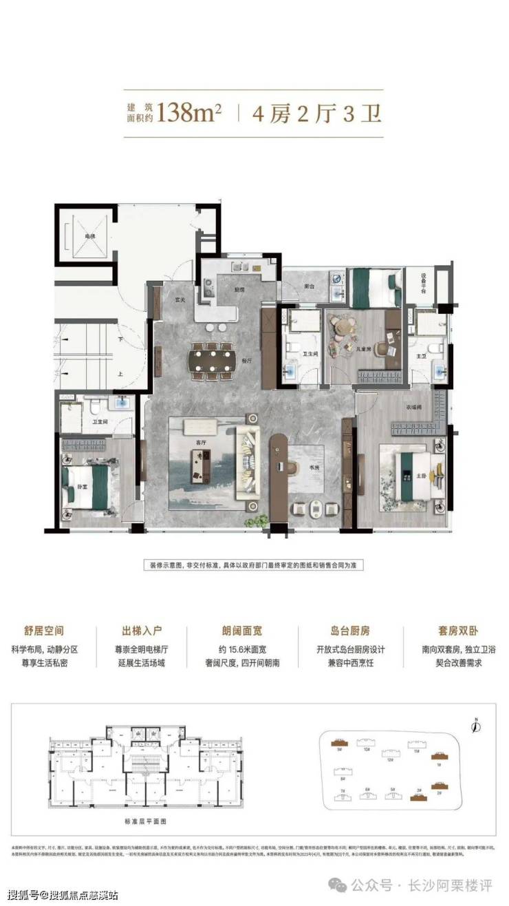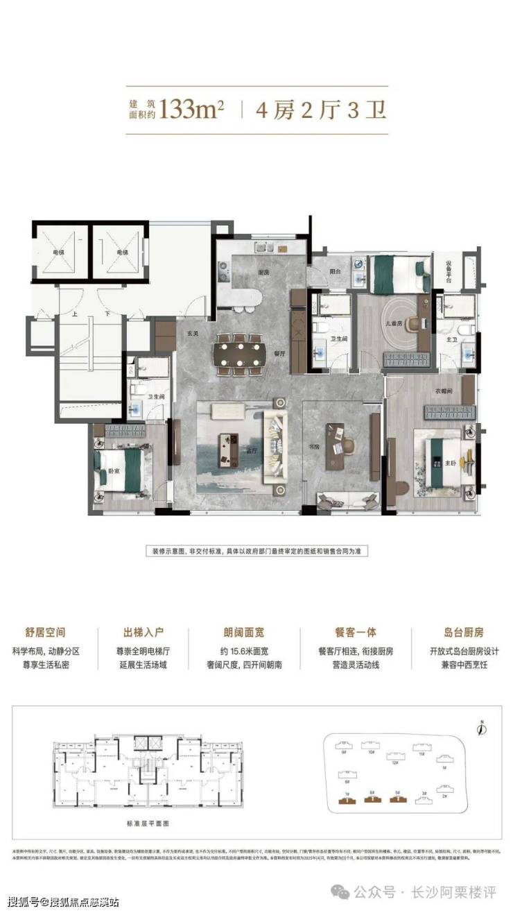 产品规划:11栋住宅(8栋29-32层高层+3栋17层小高层),围合式布局,中心景观园林面积约3300㎡(相当于3.5个足球场)公建化外立面(统一封窗)