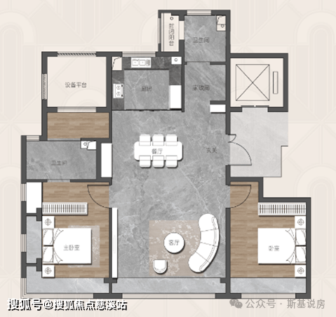 主卧套间的卫生间连接设备平台,如果设备平台改成卫生间,这个空间相当于之前户型的北次卧一样大;中西厨+岛台+餐厅一体。
