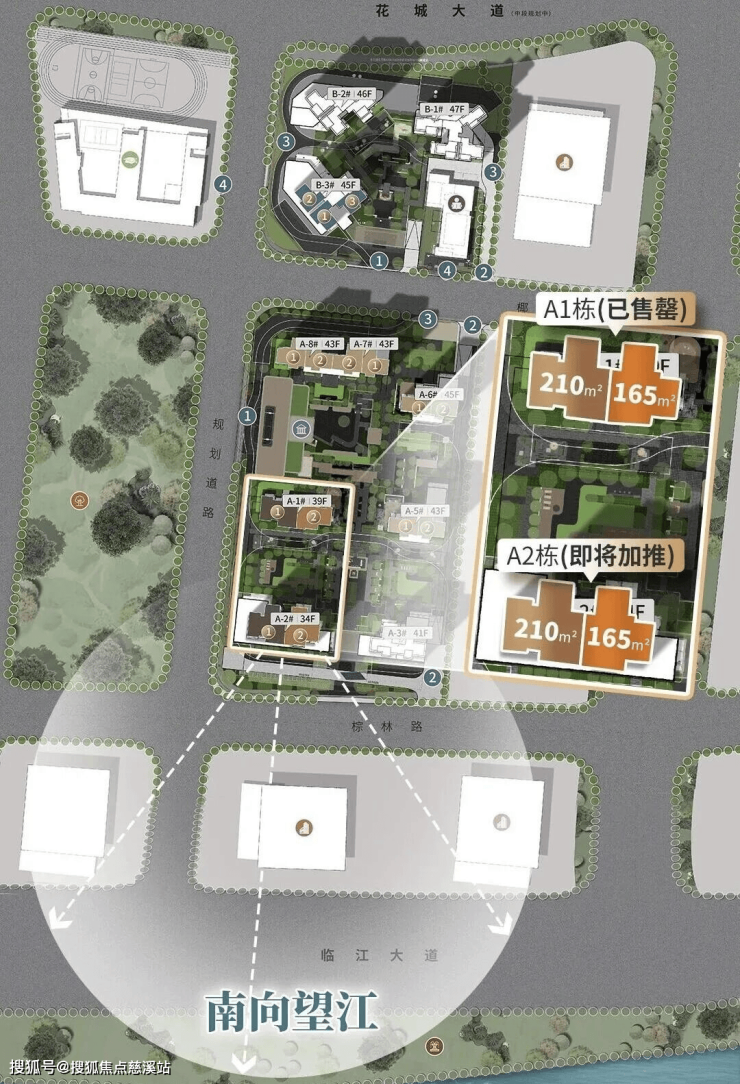 同时,A2栋具备A1栋无法比拟的核心亮点——位置与景观更优,作为“C位王炸”楼栋,它占据南向头排位置,可直接望江(暂时),景观视野极具稀缺性。