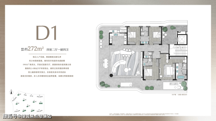 约 272㎡四室二厅一四卫:独立入户花园,约 21 米南面宽南向四开间进阶光新,IMAX 广角采光,开放式泪港方厅尽显家族排场,悬挑约 2.4 米 & 270° 环形阳台四季诗意如画,双儿童房相邻又独立,顶级主卧房步入式衣帽间双台盆配置。
