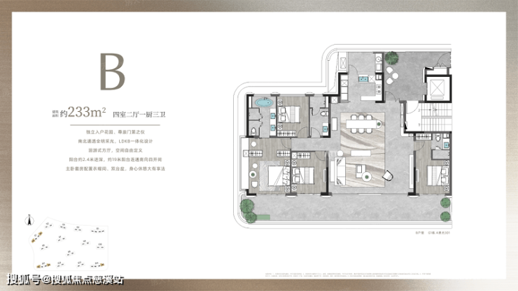 约 233㎡四室二厅一尉三卫:独立入户花园,尊崇门第之仪,南北通透全明采光,LDKB 一体化设计,游式方厅自由定义空间,约 2.4 米进深、约 919 米阳台连南向目开间,主卧房配置衣帽间、双台盆。
