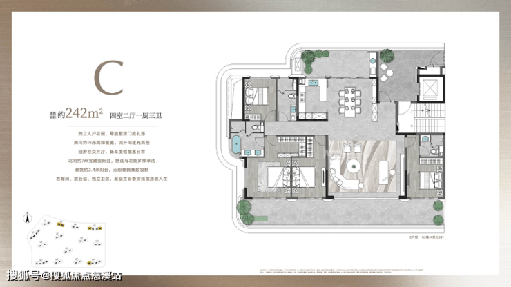约 242㎡四室二厅一厨三卫:独立入户花园,尊崇质门屏礼序,南向约 19 米画宽四开间逐光而居,游社交方厅尽享度假日常,北向约 7 米宝藏型阳台舒适与功能兼具,挑高约 2.4 米阳台赏阅美景,衣帽间、双台盆、独立卫浴的主卧套房演绎非凡人生。