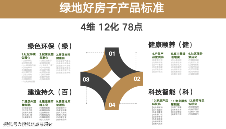 “绿地好房子”体系以“四维十二化七十八项”为核心框架,分别从绿色环保、健康颐养、建造持久、科技智能四个维度建立系统化标准: